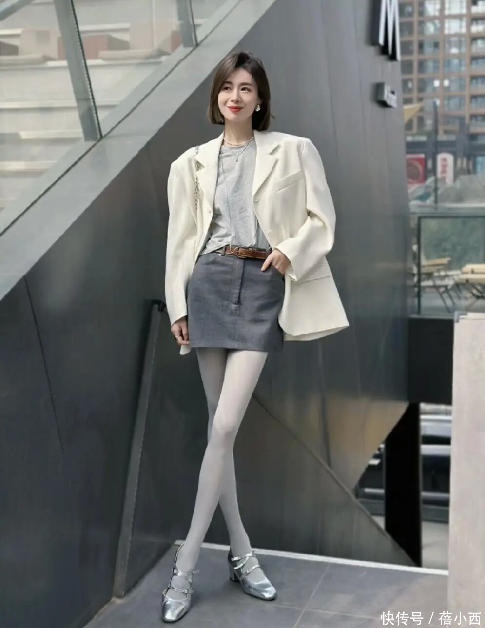白色的西装外衣再搭配上这种从简维握的牛仔短裙,给东说念主的嗅觉既超脱大气,同期又有一定的失业潮水感,而白色丝袜更是极度西宾肉体,然而它也让总计穿搭都变得愈加澄澈,彰显了目田不羁的氛围。